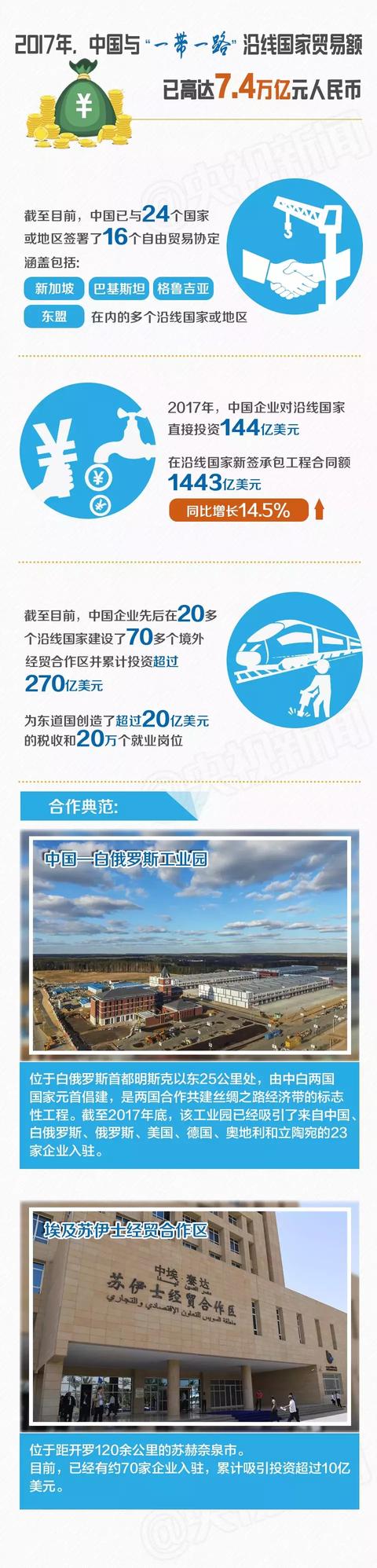 五年来,大批铁路、公路、港口、大桥和工业园区等基础设施项目破土动工乃至运营,为改善沿线国家基础设施条件、带动当地经济社会发展发挥了积极作用。印尼高铁、中老铁路、瓜达尔港、中泰铁路、匈塞铁路等标志性项目加快建设,亚吉铁路、蒙内铁路、中缅原油管道正式投入运营。截至今年8月26日,中欧班列累计开行已突破10000列,运送货物约80万标箱,国内开行城市48个,到达欧洲14个国家42个城市,运输网络覆盖亚欧大陆的主要区域。
